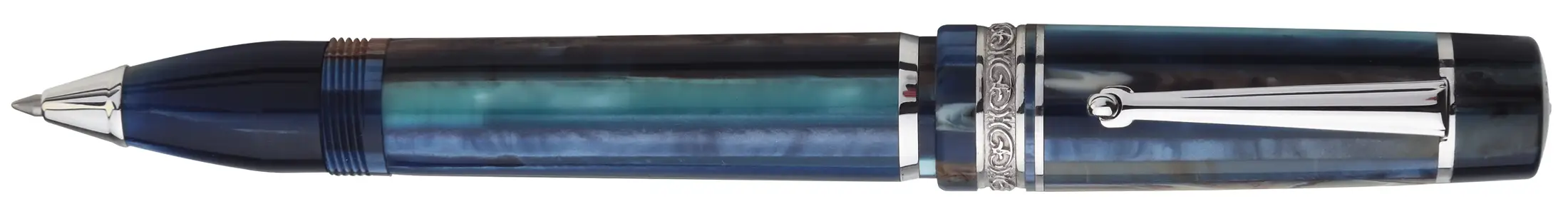 Cap and Body: Hand turned from a solid bar of special resin featuring a mesh of the Blue Jay colors.