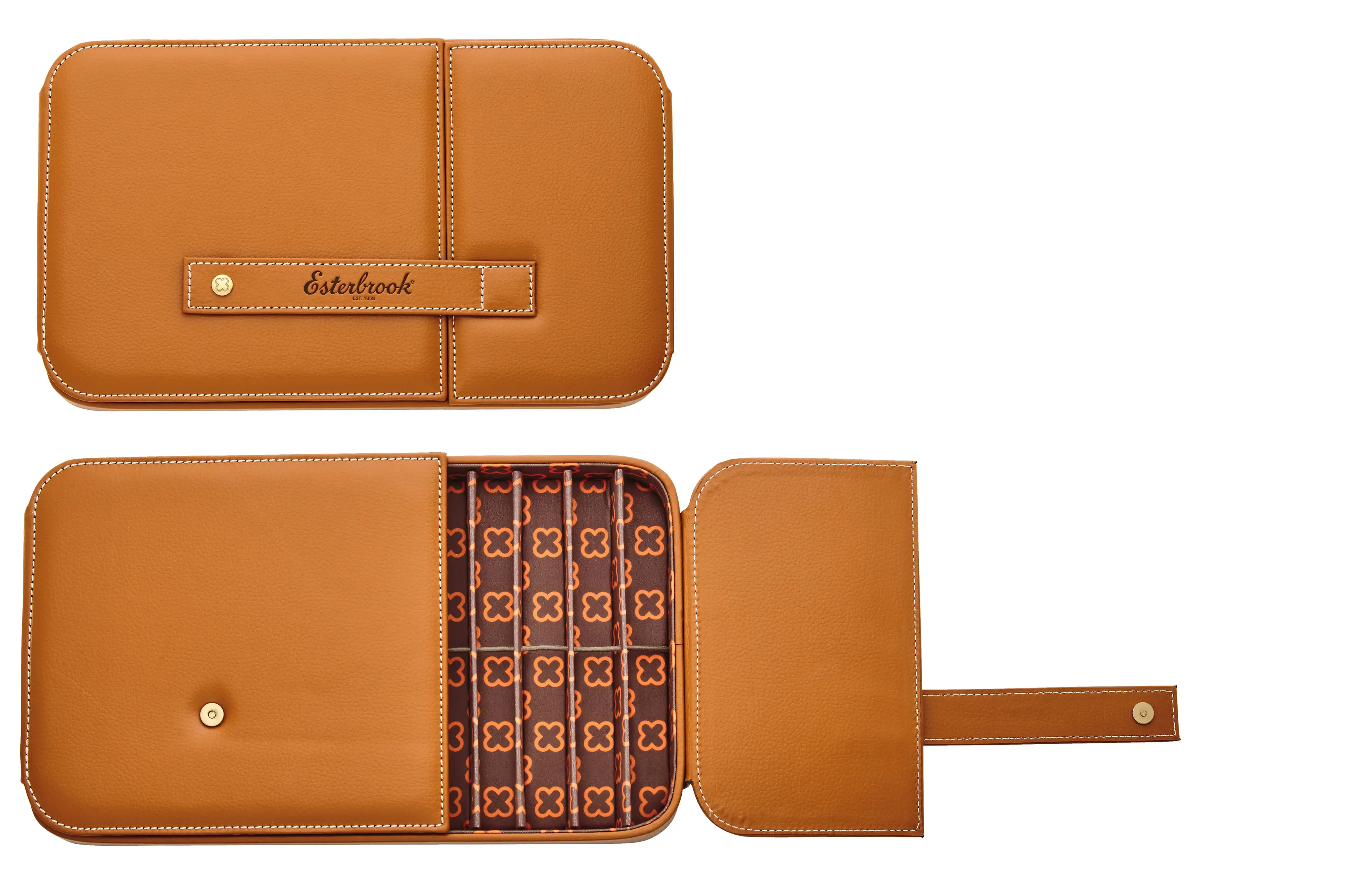 We’ve paired grained British Tan leatherette with contrast white stitching, gold hardware, our logo Esterbrook Eternity snap and lined the interior with our Esterbrook Eternity symbol in brown and orange.