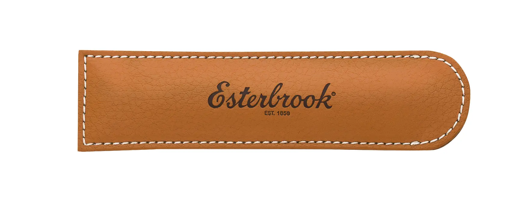 We’ve paired grained British Tan leatherette with contrast white stitching, gold hardware, our logo Esterbrook Eternity snap and lined the interior with our Esterbrook Eternity symbol in brown and orange.