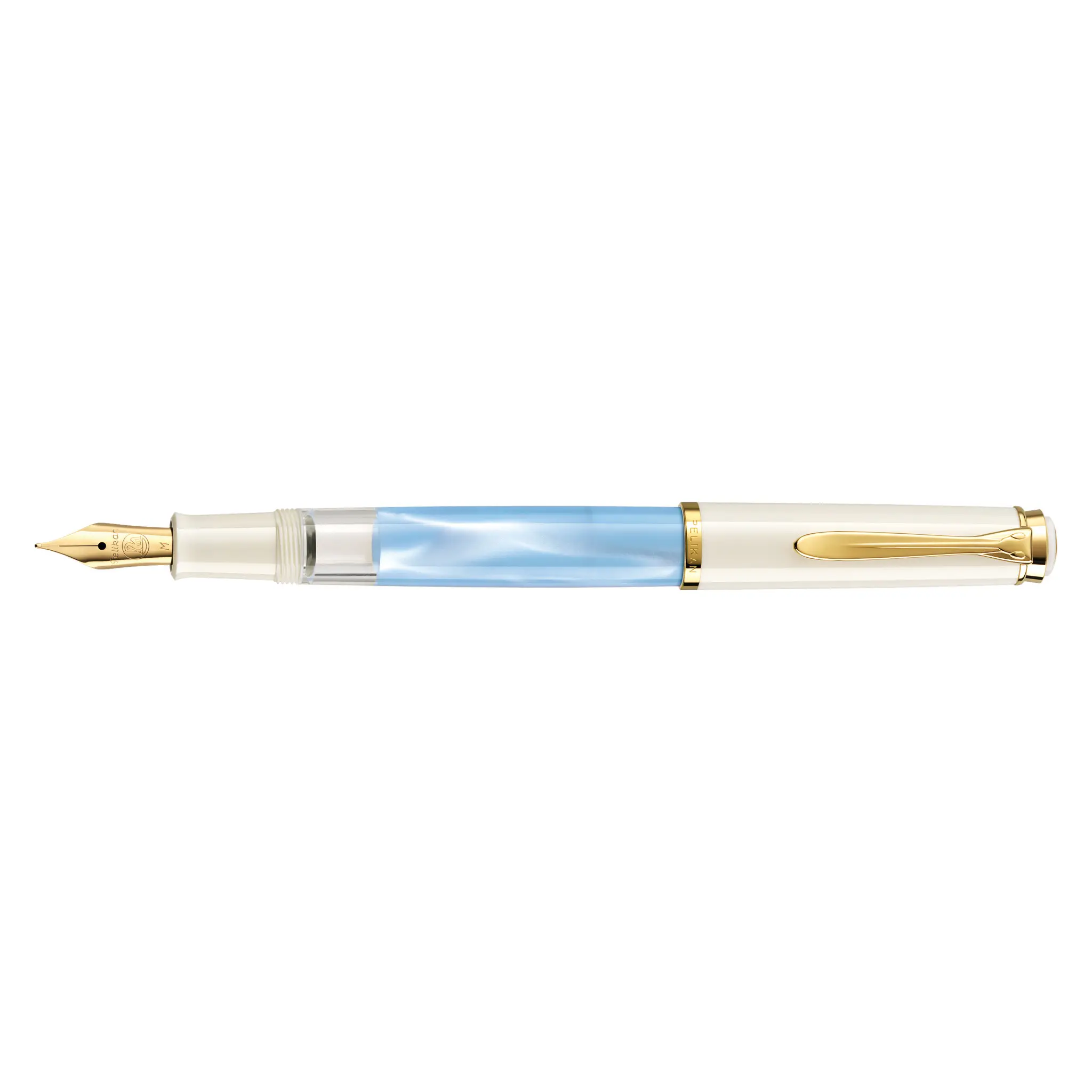The Pelikan-characteristic material is slightly transparent, allowing a view on the inside of the fountain pen. In combination with the white precious resin and the gold-plated decorative elements, a balance between classic design it carries away your imagination.