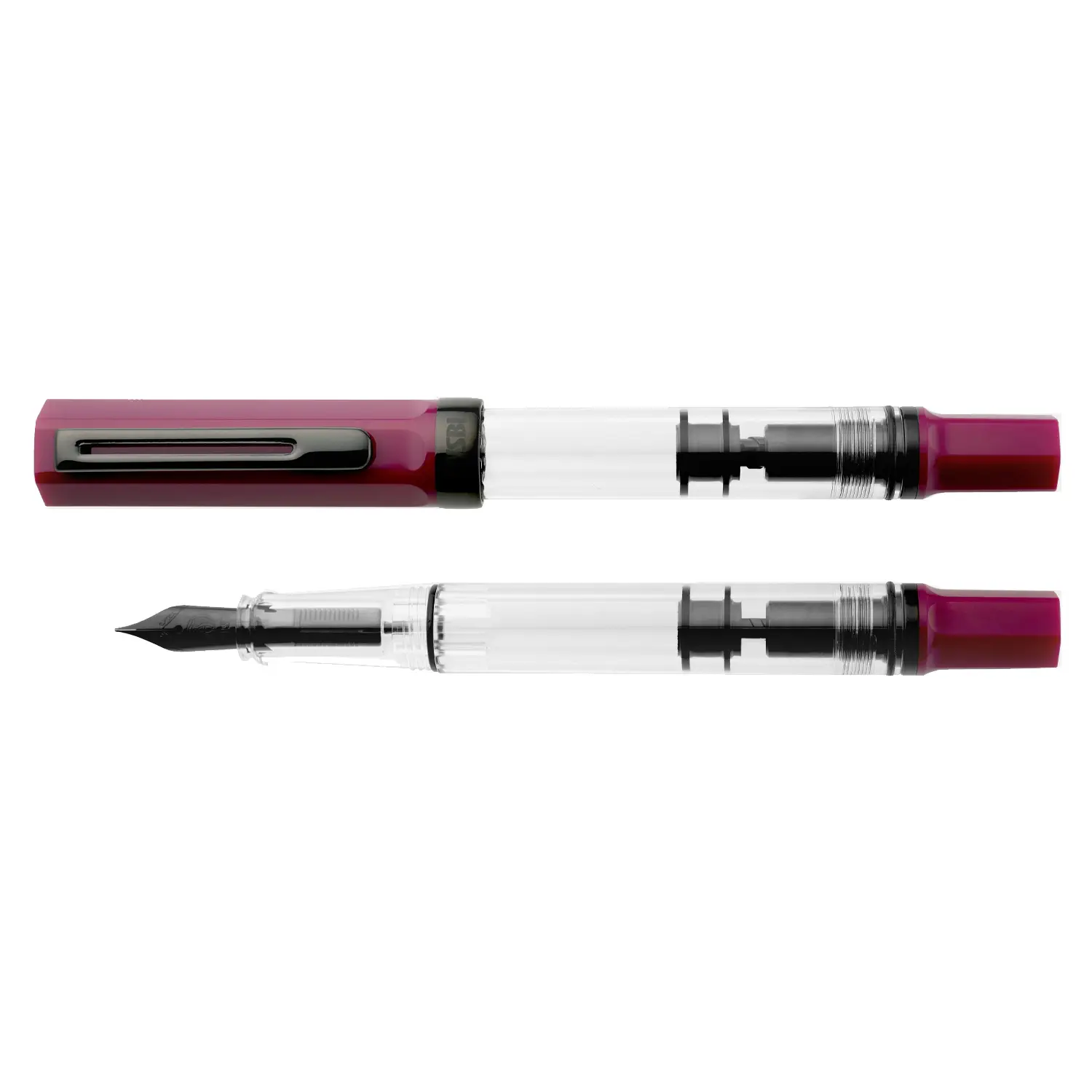 The TWSBI ECO Plum & Onyx is a stylish fountain pen featuring a transparent barrel that reveals the ink reservoir, paired with deep plum accents and sleek Onyx black trim.