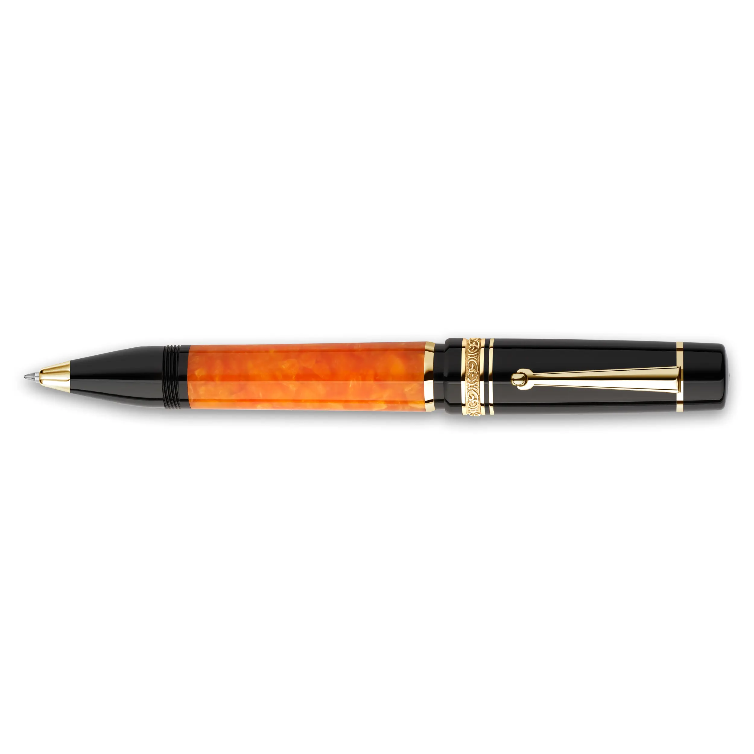 Dolcevita è caratterizzata da cappuccio e fondello neri e da un corpo arancione marmorizzato.