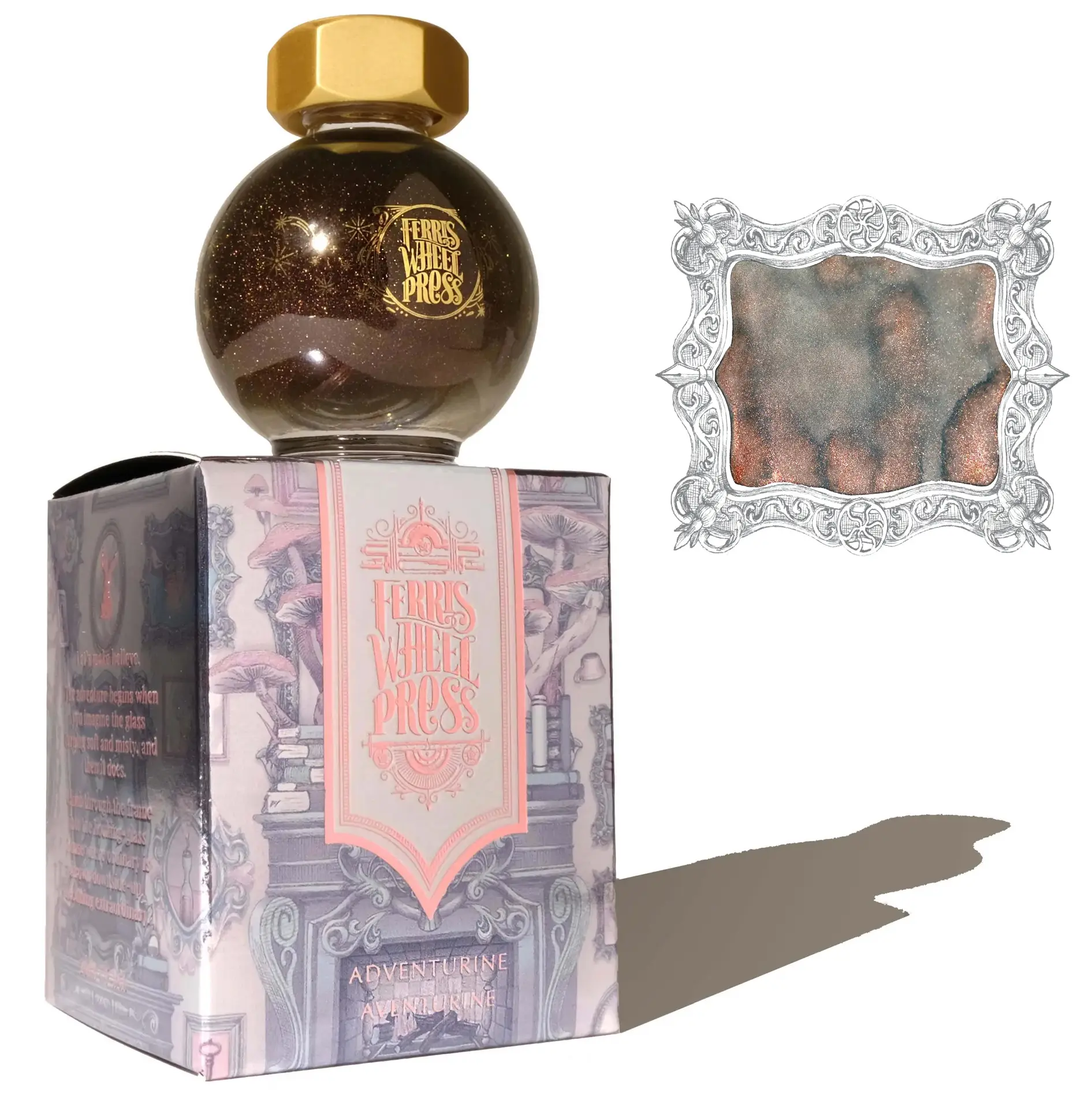 L'inchiostro Adventurine è grigio, con una leggera aggiunta di verde aqua ed oro rosa brillante.