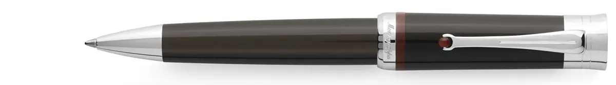 La Montegrappa Desiderio, viene prodotta in 3 colori: nero/rosso, blu/grigio e cioccolato/caramello, con finiture in argento massiccio e pennino in oro 18kt decorato a filigrana.