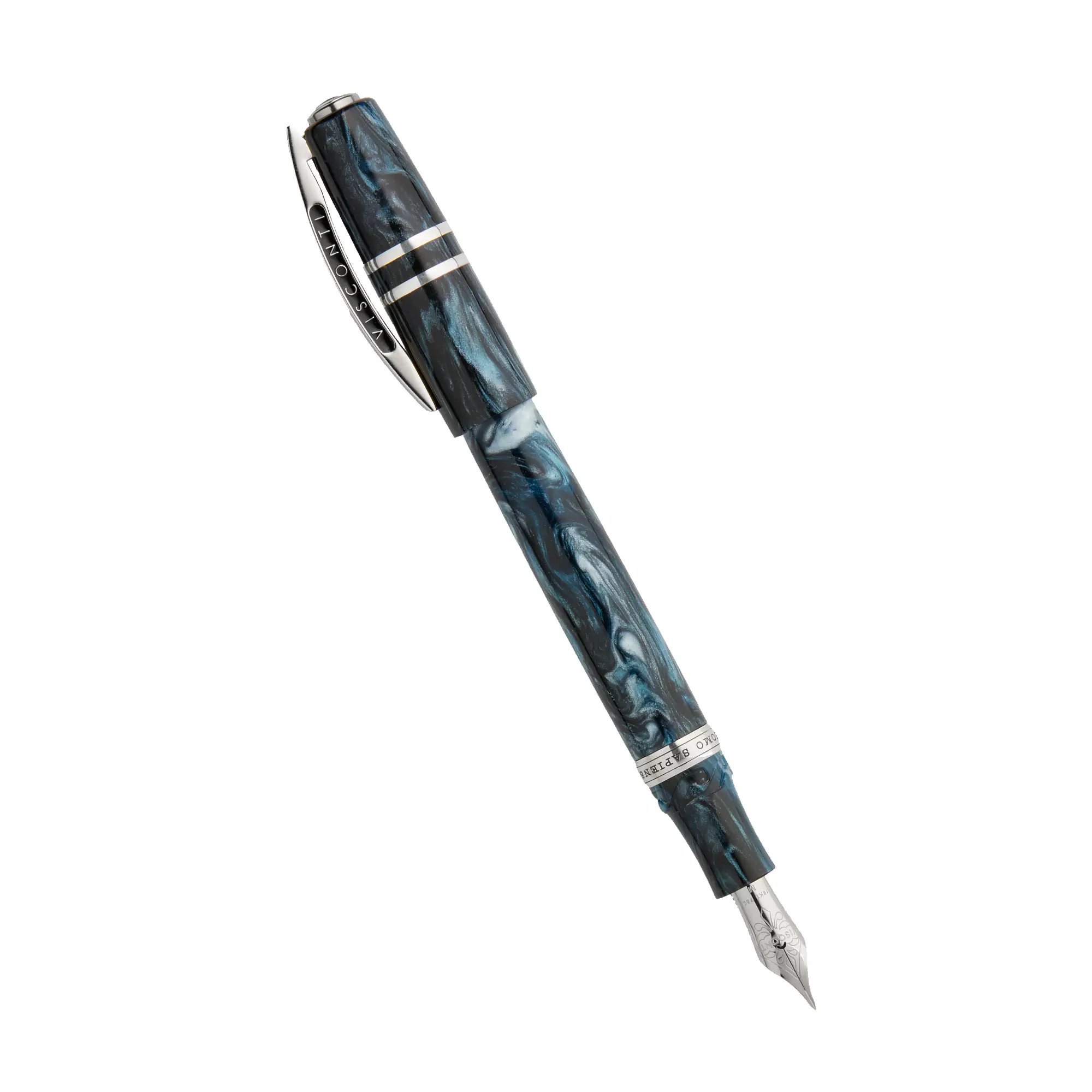 • Dark Sapphire: la resina blu profonda, attraversata da venature scure, cattura il fascino misterioso dello zaffiro pietra da sempre associata alla chiarezza di pensiero e alla saggezza interiore. È la penna per chi scrive per ritrovare stesso, per chi considera la riflessione la forma più alta di intelligenza.